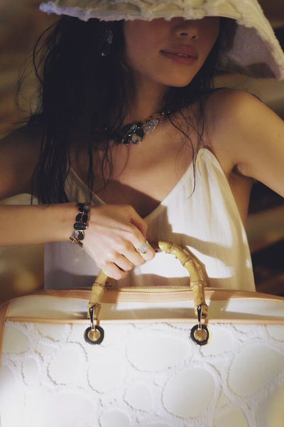 Chaque bijou est serti d'environ 300 pierres, le plus souvent des zircons, ou des perles d'eau douce. L'argent 925 millièmes que nous utilisons provient également en grande partie de sources recyclées.