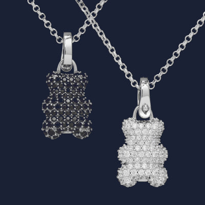 Ce collier est fabriqué à la main en argent 925 millièmes. Le Yummy Bear est serti micro-pavé d'oxyde de zirconium sur une face et spinelles noires sur l'autre.
