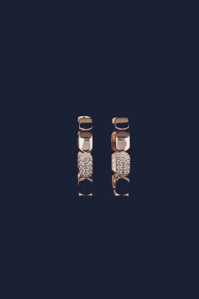 Ces boucles d'oreilles sont fabriquées avec l'Alliage APM et plaquées Or Rose 18 carats. Elles sont serties micro-pavé d'oxyde de zirconium. L'alliage APM est composé à 95% de matériaux recyclés. Il est inoxydable et antiallergique.